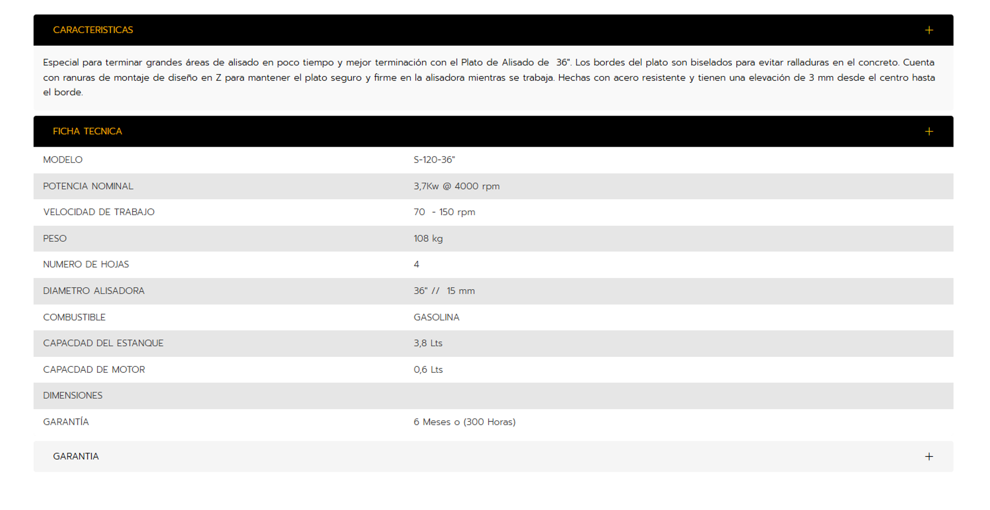 Plato de alisado: 36” (15 mm), bordes biselados para acabados finos